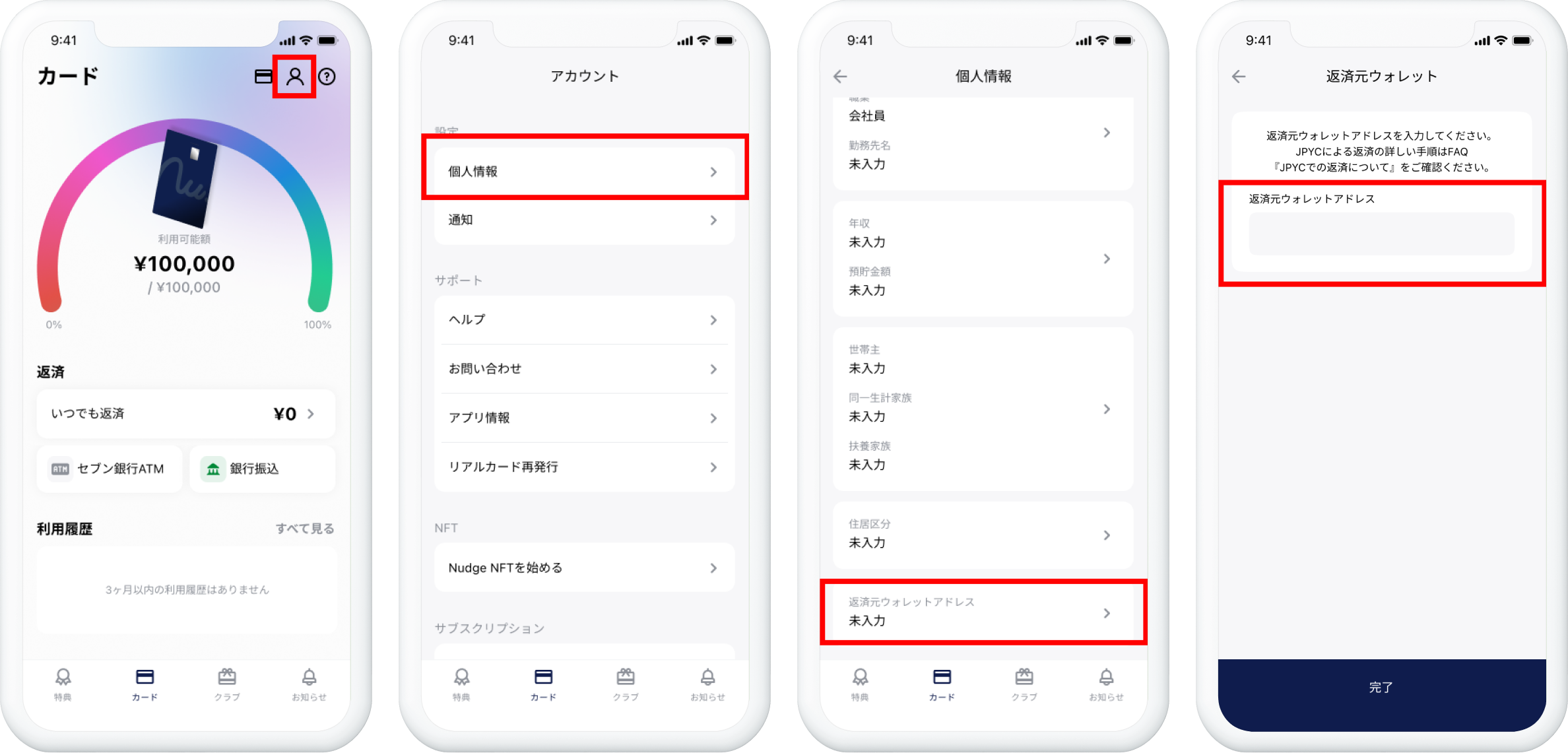ナッジカードアプリ内「返済元ウォレット」より、ご自身のウォレットアドレスを登録してください。